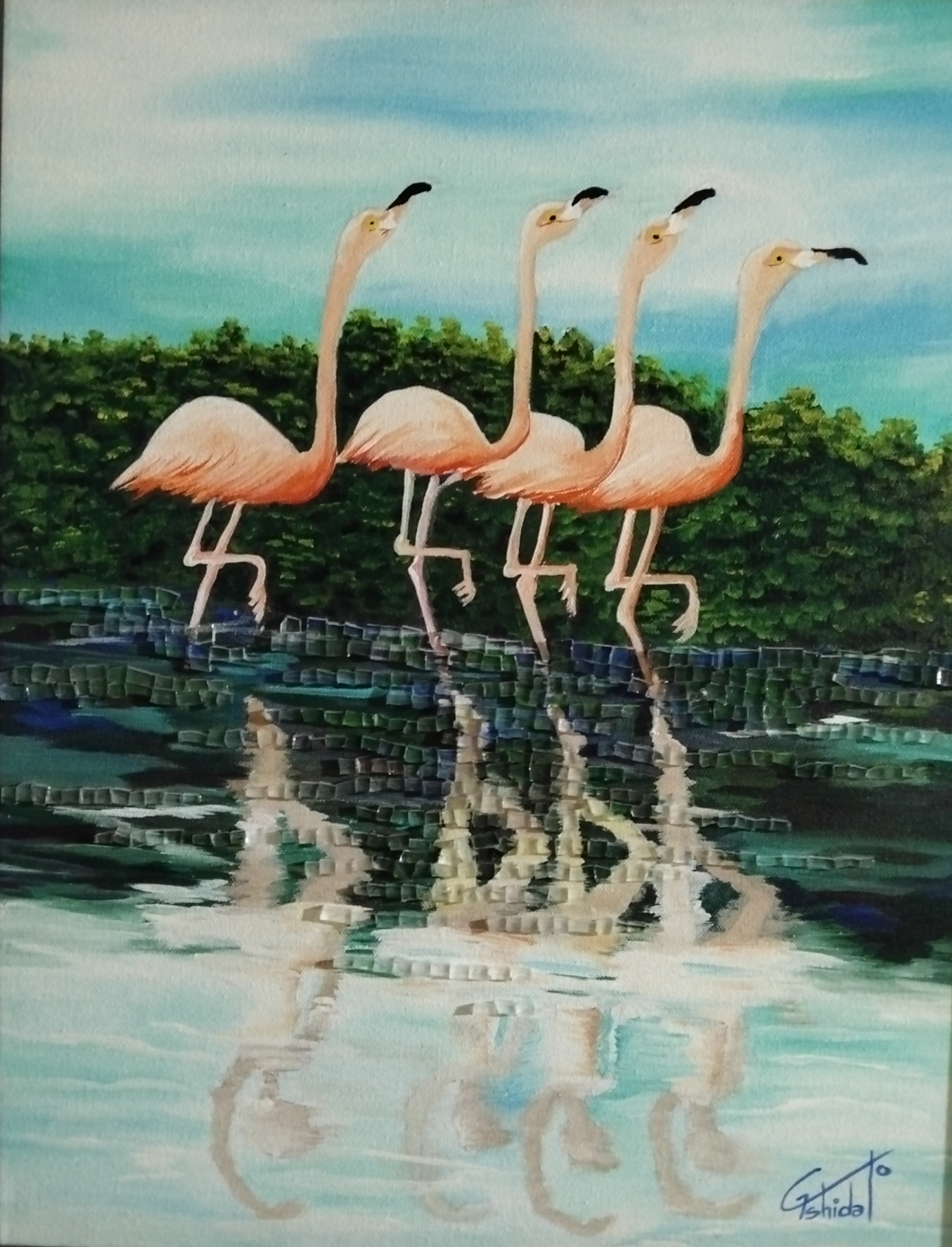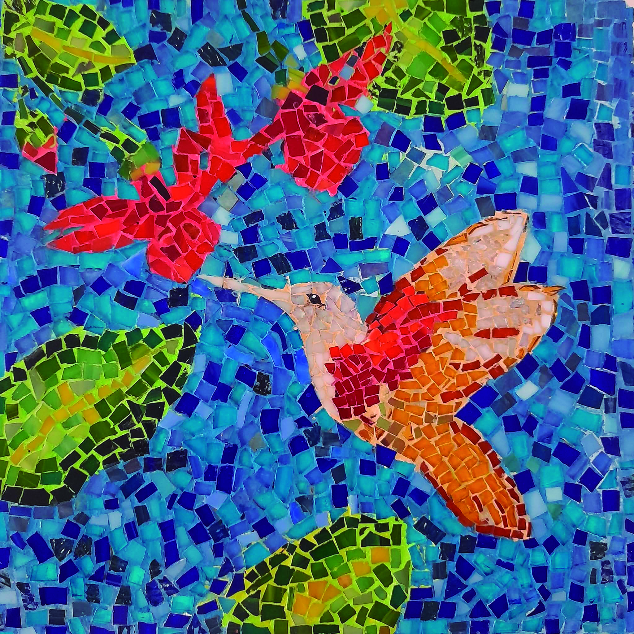 La primera obra que exhibió en una galería llevó por nombre “Reflejos de amor”, una pieza en vidrio mosaico que forma un colibrí, inspirado en la casa de su abuela, ya que tenía un ventanal frente al comedor y mientras comían o platicaban en familia, veían a los colibríes que reposaban sobre la enredadera de flores naranjas que adornaban el marco de la ventana.