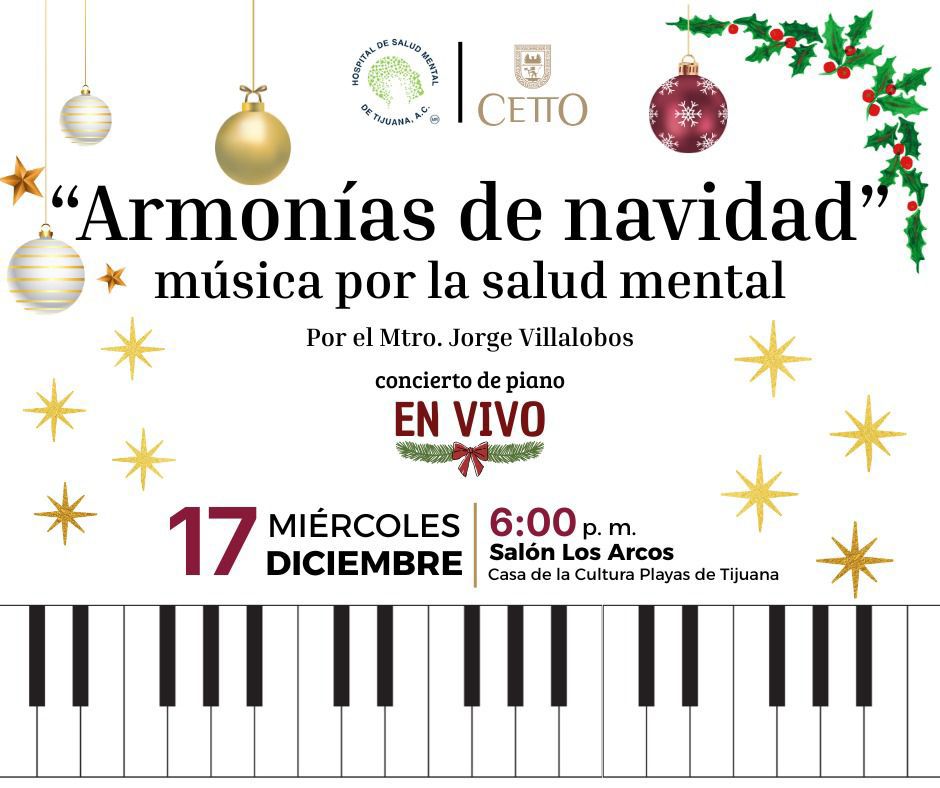 El Hospital de Salud Mental de Tijuana A.C., invita a la comunidad a sumarse al concierto de piano: “Armonías de navidad: música por salud mental” por el Mtro. Jorge Villalobos, que tendrá lugar este próximo miércoles 17 del mes en curso en la Casa de la Cultura de Playas de Tijuana a las 18:00 hrs.
